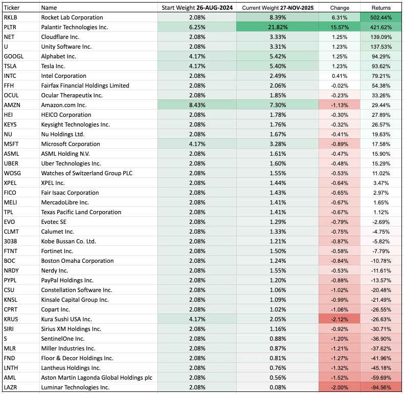 总共提交了 39 家不同的公司。获得超过 1 票的公司在初始配置中将获得更高的权重。热门推荐公司如亚马逊(初始权重 8.43%)和 Palantir (初始权重 6.25%)就是这种情况。下表列出了每家公司的持仓情况、从建仓到 2025 年 11 月 27 日的权重绝对波动值,以及每只股票在此期间的收益率。