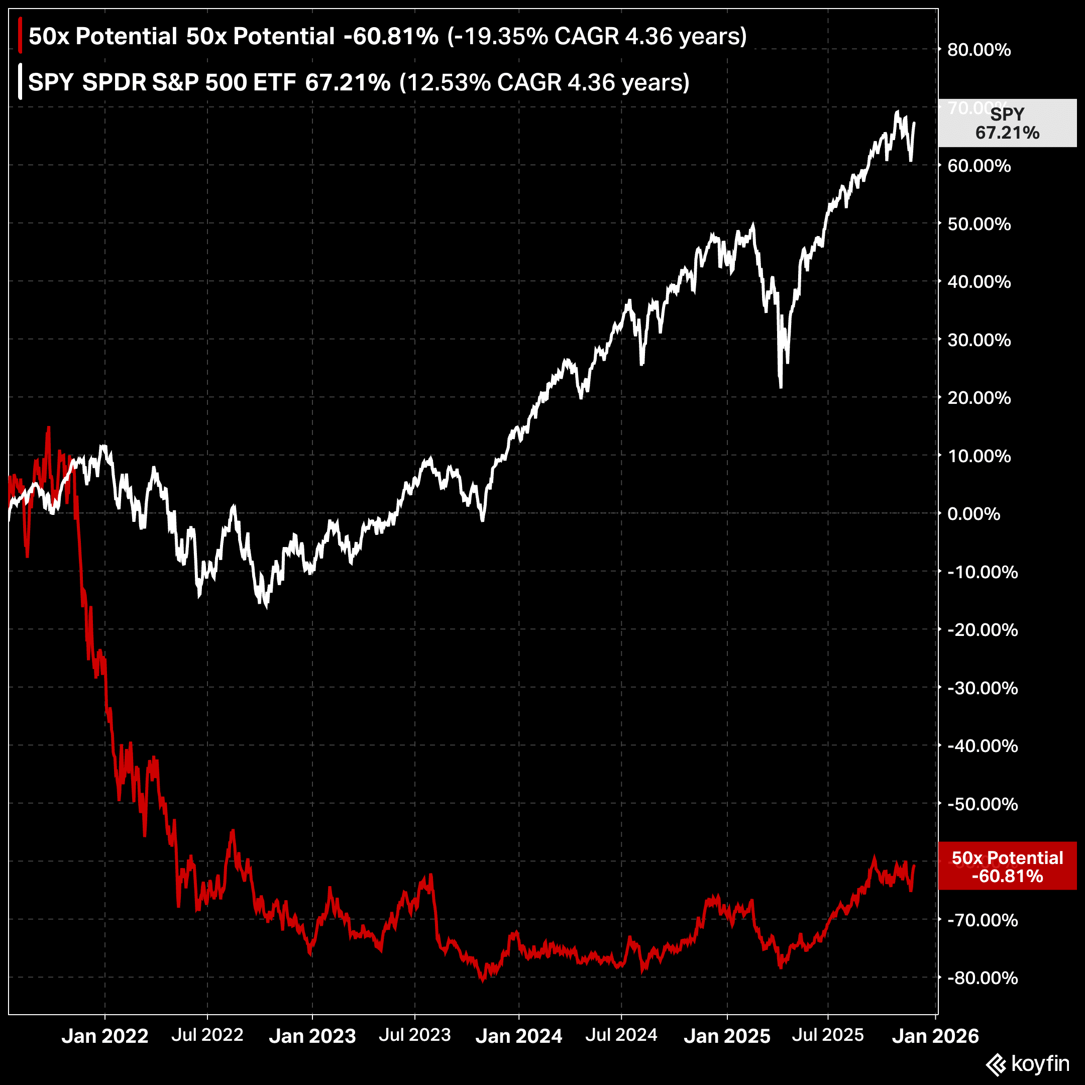 自从那篇臭名昭著的关于未来“市值超过 5000 亿美元”公司的帖子发布以来,该投资组合的价值已经损失了 61%,而标准普尔 500 指数的年复合增长率为 12.5%,总回报率为 67%。