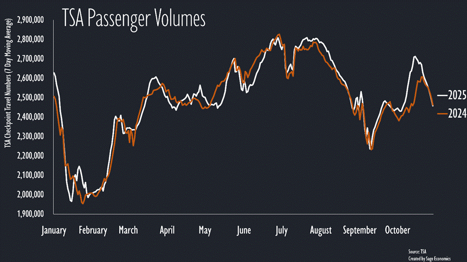 根据美国运输安全管理局(TSA)的数据,过去一周的航空旅客人数低于去年同期水平。另外值得关注的是:我们曾推测政府停摆影响了过去几周的航空旅客人数,但正如一位热心读者指出的那样,航空旅客人数的下降很可能是由于2024年10月中旬的恶劣天气造成的,而非数据本身的问题。