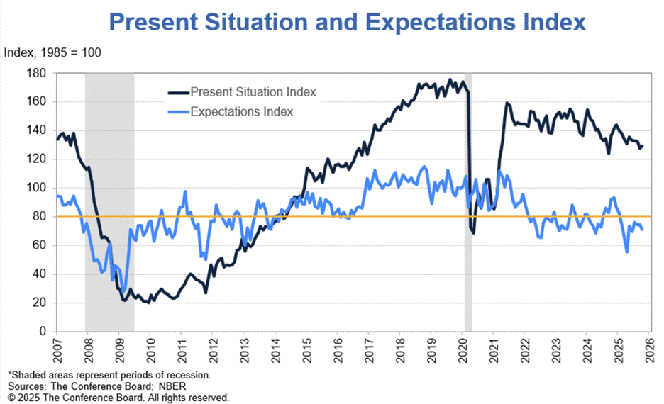 这项衡量消费者信心的指标在10月份有所下降。该指数由两部分组成:评估当前状况的部分当月有所改善,而展望未来的部分则有所恶化。