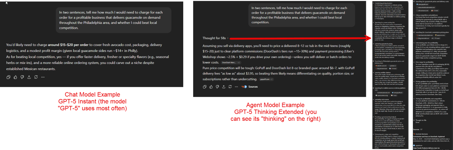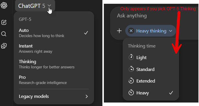 对于 ChatGPT,无论你使用免费版还是付费版,默认提供的模型都是“ChatGPT 5”。问题在于,GPT-5 并非单一模型,而是多种多样,从非常弱的 GPT-5 mini 到非常优秀的 GPT-5 Thinking,再到极其强大的 GPT-5 Pro。当你选择 GPT-5 时,你真正获得的是“自动”模式,AI 会决定使用哪个模型,通常是性能较弱的模型。付费后,你可以决定使用哪个模型,而且,更复杂的是,你还可以选择模型“思考”答案的强度。对于任何复杂的问题,我总是手动选择 GPT-5 Thinking Extended(20 美元套餐)或 GPT-5 Thinking Heavy(如果你购买的是 200 美元的型号)。对于需要大量思考的真正难题,你可以选择最强大的模型 GPT-5 Pro,但只有在最高价位才有。