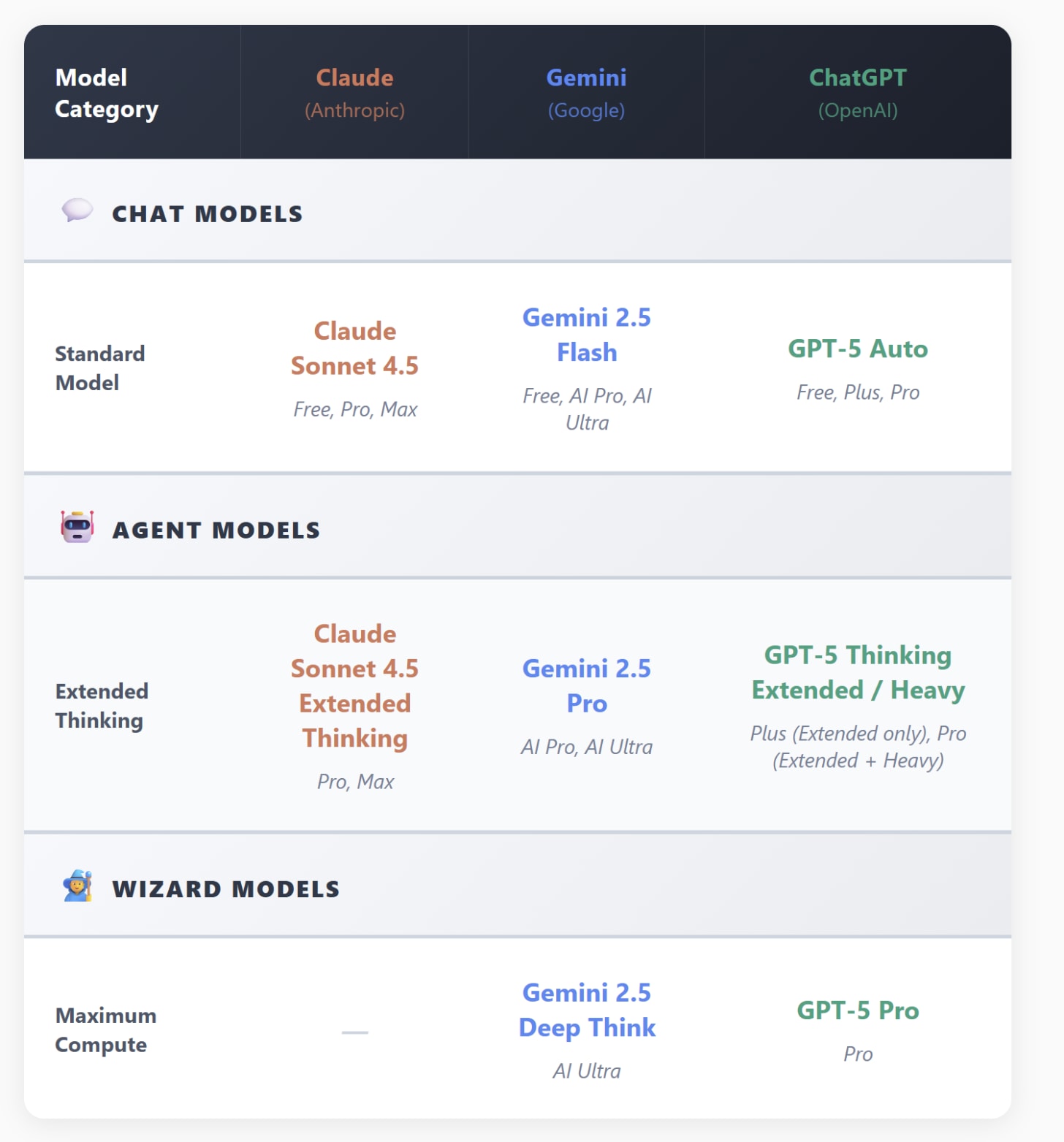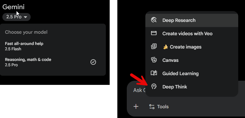 对于 Gemini,你只有两个选择:Gemini 2.5 Flash 和 Gemini 2.5 Pro,但如果你购买 Ultra 套餐,则可以访问 Gemini Deep Think(位于另一个菜单中)。目前,Gemini 2.5 是主流 AI 模型中最弱的(尽管仍然相当强大,Deep Think 也非常强大),但预计新的 Gemini 3 将在未来几个月内推出。