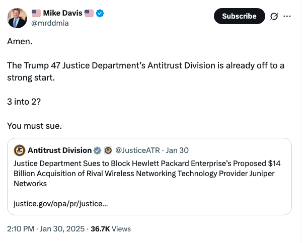 这是一个显而易见的案例,该部门于今年1月申请阻止合并,此举得到了“让美国再次伟大”(MAGA)运动的影响者迈克·戴维斯(Mike Davis)的欢呼。戴维斯与唐纳德·特朗普关系密切,并在特朗普第一任期的大部分时间里负责司法提名。戴维斯以民粹主义者、特朗普的坚定捍卫者以及针对大型科技公司的诉讼案支持而闻名。他经常做客史蒂夫·班农(Steve Bannon)的节目,并帮助阻止了人工智能监管禁令的实施。此次挑战表明戴维斯的民粹主义风格正在兴起,这让华尔街感到恐慌。