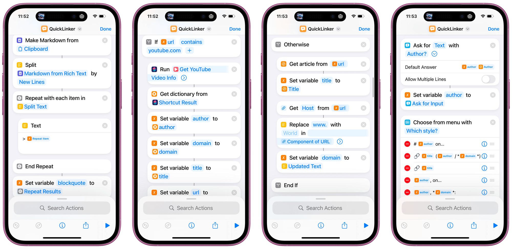- 使用命名变量而不是魔法变量以获得更高的清晰度和灵活性。这就是我如何以不同的方式对待 YouTube 链接,并从作为函数运行的不同快捷方式中获取一整套独立但兼容的