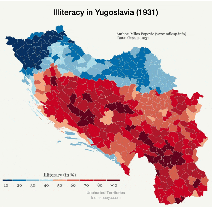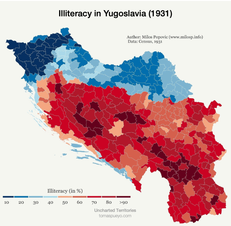 我们做过波兰和德国的幻影地图。我偶然发现了这张前南斯拉夫的幻影地图,它显示了文盲率与奥斯曼帝国统治的密切相关: