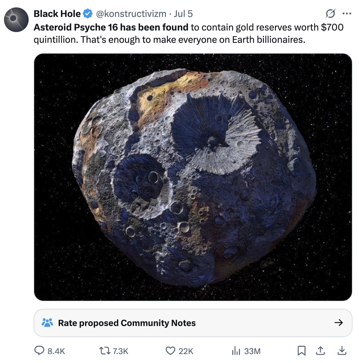 记者推测,如果我们将这颗小行星带回地球,其金属价值将非常巨大:每吨铁价值424 美元,镍价值 1.4 万美元,黄金价值 7500 万美元,所以只要大部分成分是金属,这颗小行星的价值就高达数千万亿美元,无论其成分如何。