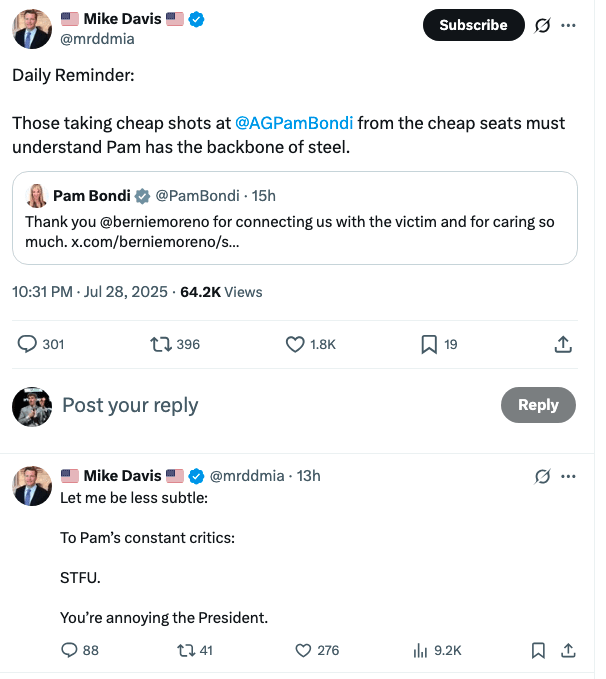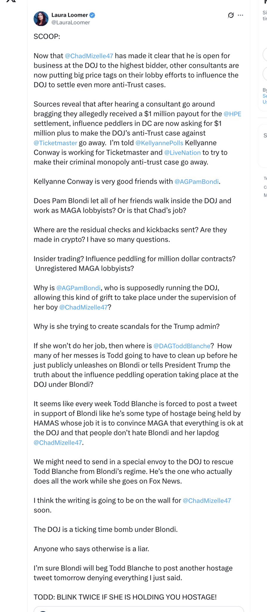 此外,一位非常重要的“让美国再次伟大”(MAGA)影响者、与特朗普私交甚密的劳拉·鲁默(Laura Loomer)也愤怒地报道了此事,并在随后删除的一系列推文中点名了特朗普的司法部长(她戏称其为“帕姆·布隆迪”)和幕僚长米泽尔(Mizelle)。这些推文中充斥着各种奇特的内部消息,但她所指控的实质内容却相当丑陋。