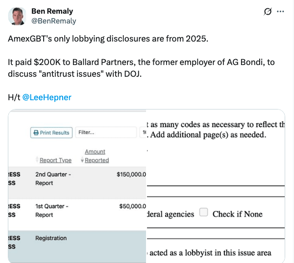 然而,我们阻止企业掠夺美国的努力显然正在被瓦解。今天,反垄断部门又撤销了一项合并挑战,这次挑战针对的是美国运通全球商务旅行集团收购CWT控股公司,该交易旨在通过“移除一个大型竞争对手”来减轻“价格压力”。我想这其中可能没有任何贿赂,但我还是想问。为什么没有?一群与特朗普有关联的说客收了钱,才让这起案件不了了之,而这还只是披露的金额。