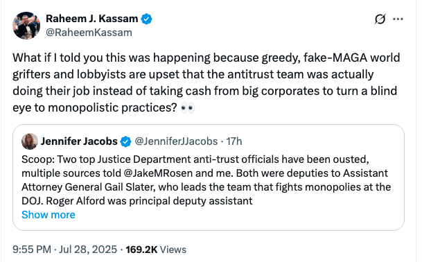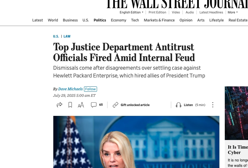 确实如此,这种行骗手段确实令人咋舌,而且往往奏效。上周,我注意到反垄断部门发生了一起未遂政变,保守派之间互相攻击。两名特朗普任命的反垄断副助理检察长因一桩涉及惠普的数十亿美元并购交易而受到一群企业说客“让美国再次伟大” (MAGA) 影响者的威胁。其中一位受到攻击的官员罗杰·阿尔福德 (Roger Alford) 以敌视说客而闻名。今天,《华尔街日报》报道称,包括阿尔福德在内的这些特朗普官员已被解雇。因此,现在特朗普反垄断主管盖尔斯莱特 (Gail Slater) 的下台或成为傀儡只是时间问题了。
