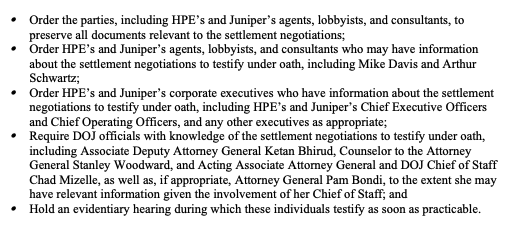 本案法官凯西·皮茨曾是一名劳工律师,曾在一家公益律师事务所工作。所以,如果你是一位“让美国再次伟大”(MAGA)的企业说客,这可不是什么好主意。今天,四位民主党参议员——伊丽莎白·沃伦、艾米·克洛布查尔、科里·布克和理查德·布卢门撒尔——就《坦尼法案》的审理程序致函皮茨法官,详细阐述了所有这些问题。在信中,他们敦促法官命令迈克·戴维斯、查德·米泽尔和亚瑟·施瓦茨宣誓作证,并强制惠普和瞻博网络的首席执行官和首席运营官也这样做。
