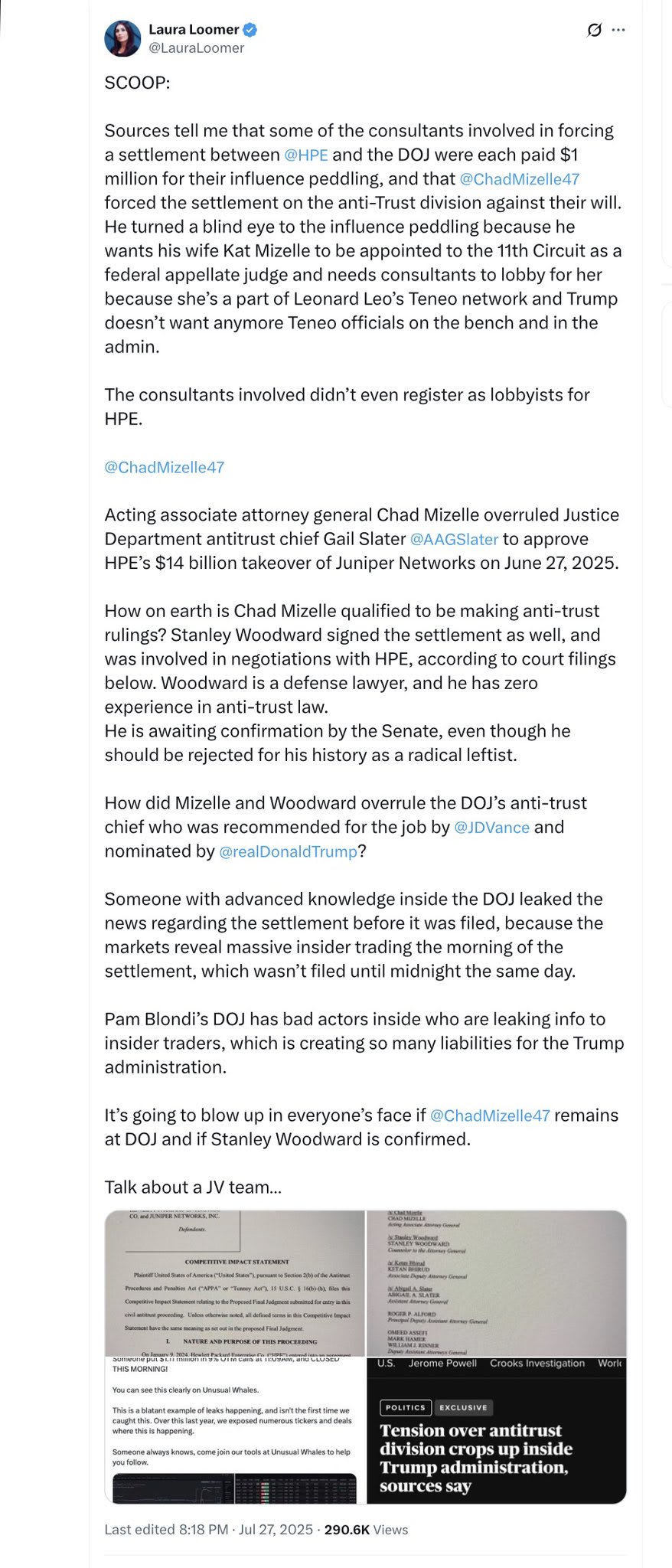 几个月前,惠普公司聘请了施瓦茨和戴维斯以及其他一些未透露姓名的人员,以争取美国司法部批准其与瞻博网络公司价值140亿美元的合并案。戴维斯和施瓦茨希望以对惠普公司有利的条件和解此案,但斯莱特犹豫不决。于是,与特朗普关系密切的戴维斯和施瓦茨让帕姆·邦迪的幕僚长查德·米泽尔否决了斯莱特关于这笔交易的决定。随后,据报道,米泽尔在可能得到邦迪批准的情况下,解雇了两名下属,理由是他们不服从命令并向媒体泄密。目前尚不清楚究竟发生了什么,尤其是在涉及这么多撒谎的骗子的情况下。一篇关于斯莱特的攻击性文章被泄露给了一位与米泽尔关系密切的哥伦比亚广播公司记者詹妮弗·雅各布斯。米泽尔泄露了这篇文章吗?他是否因此将自己的行为归咎于敌人,并因此解雇了他们?谁知道呢?
