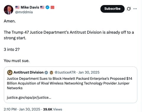 在特朗普总统任期之初,也就是2025年1月,时任代理反垄断局长的阿塞菲选择提起诉讼,阻止惠普收购瞻博网络。而戴维斯却出人意料地借此大肆宣扬特朗普强硬的反垄断民粹主义政策。