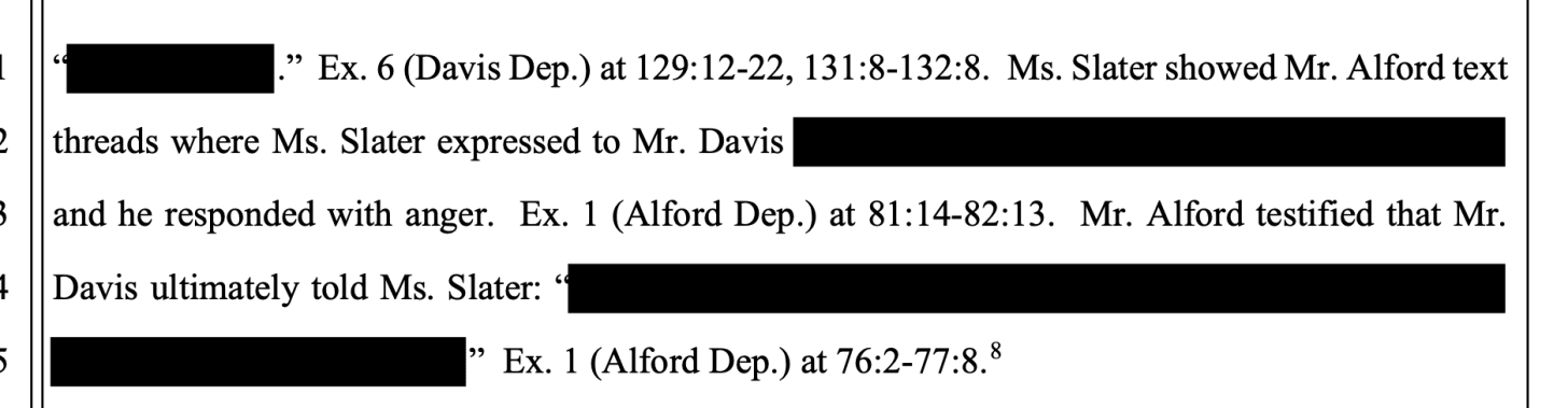 但斯莱特继续反抗。五月中旬,戴维斯终于忍无可忍,因为他认为自己帮她找到了这份工作,而她却不肯配合。她的“批评激怒了戴维斯先生,导致他和斯莱特女士在五月中旬决裂。大约在同一时间,戴维斯先生和斯莱特女士进行了激烈的口头和短信交流。” 可惜的是,其中的脏话已被删去。