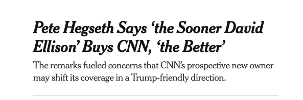 其次,并购法显然是特朗普政府滥用的核心机制之一。本周,国防部长皮特·赫格塞斯将反垄断法置于伊朗战争的核心地位,声称美国需要“爱国媒体”,并鼓励围绕派拉蒙-华纳交易的裙带关系。