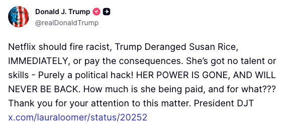 你开始看到本届政府内部出现了其他严重的裂痕。本周早些时候,Netflix董事会成员、前奥巴马国家安全顾问和拜登国内政策委员会主席苏珊·赖斯公开表示,如果中期选举期间政权更迭,那些非法为特朗普效力的公司和律师事务所将面临调查。特朗普的回应是要求Netflix解雇赖斯,Netflix目前正在竞购华纳兄弟。