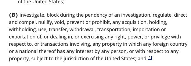我们先来看最高法院裁决的具体内容。裁决认为,赋予总统应对紧急情况的广泛经济权力的《国际紧急经济权力法》(IEEPA)中并未包含“关税”一词,因此并未授权总统征收关税。这种对法律的解读有些奇怪,也与专门审理贸易案件的下级法院的解读相悖。这些下级法院驳回了特朗普的关税,认为其属于任意征收,但同时指出,该法确实授权总统在紧急情况下征收临时性定向关税。如果你仔细研究该法条,就会发现下级法院的解读是合理的。IEEPA允许总统颁发许可证、进行监管,以及处理许多其他与贸易相关的事务。以下是该法的部分内容: