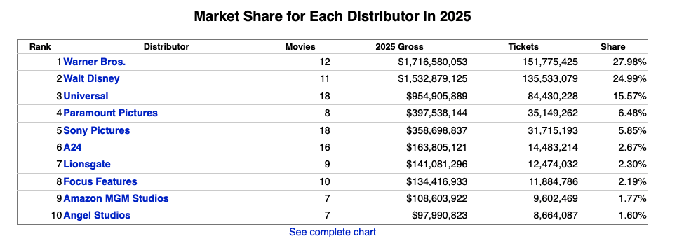 换句话说,执法人员正在密切关注此事。这有道理吗?首先,让我们来看看市场份额数据,这些数据表明这笔合并交易存在问题。目前全球有五大电影公司——迪士尼、环球影业、索尼影业、派拉蒙影业和华纳兄弟——而这笔交易将合并其中两家,使市场由五家互相竞争的公司变成四家。就在几年前,市场还有六家,但迪士尼收购福克斯后,规模缩减到五家。以2025年的院线发行量来看,华纳目前排名第一,派拉蒙排名第四。