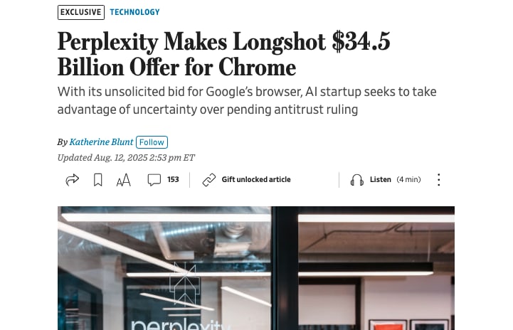但我想重点谈谈谷歌搜索垄断案即将做出的判决。这要从本周发生的事情说起:人工智能聊天机器人公司Perplexity公开提出,以340亿美元的价格从谷歌手中收购拥有40亿用户的Chrome浏览器。