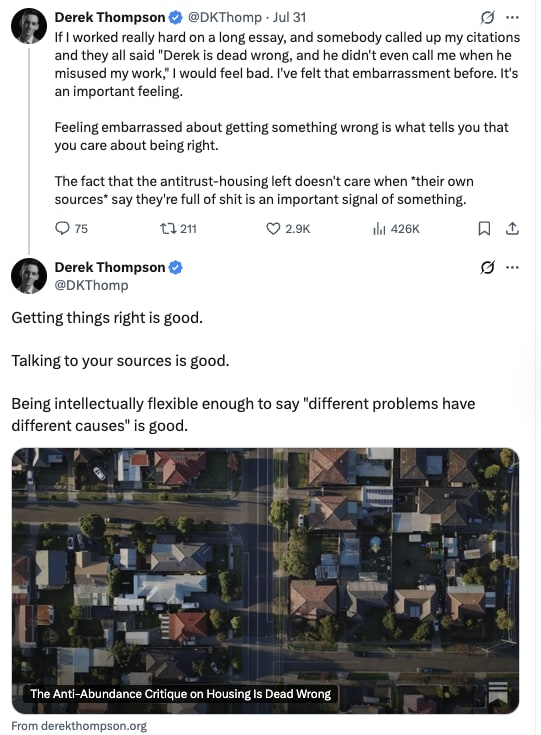 哇!这可是个严重的指控。如果属实,那就意味着穆沙巴什(以及斯托勒)是个毫无新闻素养、毫无悔意的骗子,只会歪曲事实、曲解他人言论,以迎合他的理想结论。这也会推翻那些批评企业住房集团化的主要观点,巩固“丰裕”式的放松管制才是未来左右翼政治的最佳路径。唯一的问题是,兰斯·兰伯特说德里克·汤普森从未问过他关于穆沙巴什论文的事!兰伯特在X/Twitter上发表声明澄清说,汤普森从未提及穆沙巴什的文章。