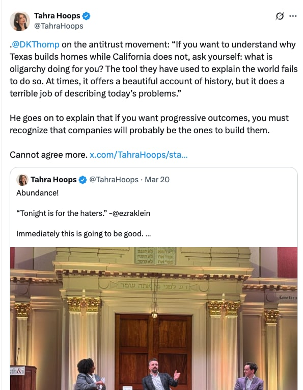 上周,汤普森发表了一篇文章,称反垄断的房地产左派——我引用一下——“一派胡言”。在文章中,汤普森批评了巴塞尔·穆沙巴什在马特·斯托勒的《BIG》杂志上发表的一篇论文,该论文认为企业合并和私募股权投资推高了德克萨斯州达拉斯的房价。汤普森颇为自夸地声称,他联系了穆沙巴什的一位专家消息来源——兰斯·兰伯特,而兰伯特(据汤普森所说)则表示穆沙巴什“歪曲了我的观点,得出了可疑的、甚至是完全错误的结论”。