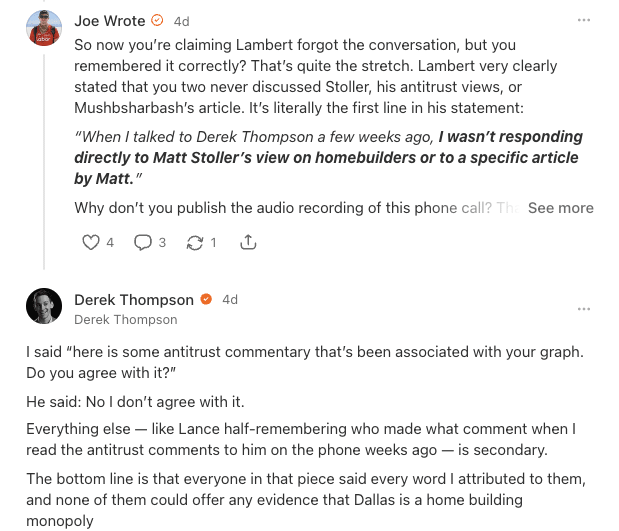 不仅仅是兰伯特,我还联系了汤普森引用的另一位消息来源,一位名叫路易斯·昆特罗的经济学家。昆特罗告诉我,他从未否认过BIG的那篇文章,因为汤普森从未向他展示过,也没有在采访中提及过。结果发现,汤普森所做的基本上是询问文章中提到的几个人——这些人都没有读过BIG的文章,也没有对达拉斯-沃斯堡地区房屋建筑行业的行为进行过任何有意义的分析——他们是否能根据汤普森提供的市场份额或其他数据得出结论,认为一个非法卡特尔组织正在达拉斯-沃斯堡地区经营房屋建筑业务。然后,他写了一篇文章,暗示穆沙尔巴什的“消息来源”否认了我们的文章,但事实并非如此。(事实上,昆特罗正在撰写他自己对德里克文章的回应,以纠正德里克对他观点的错误印象,这种观点不仅针对原文,也针对金融和企业整合对住房供应总体影响的观点。)