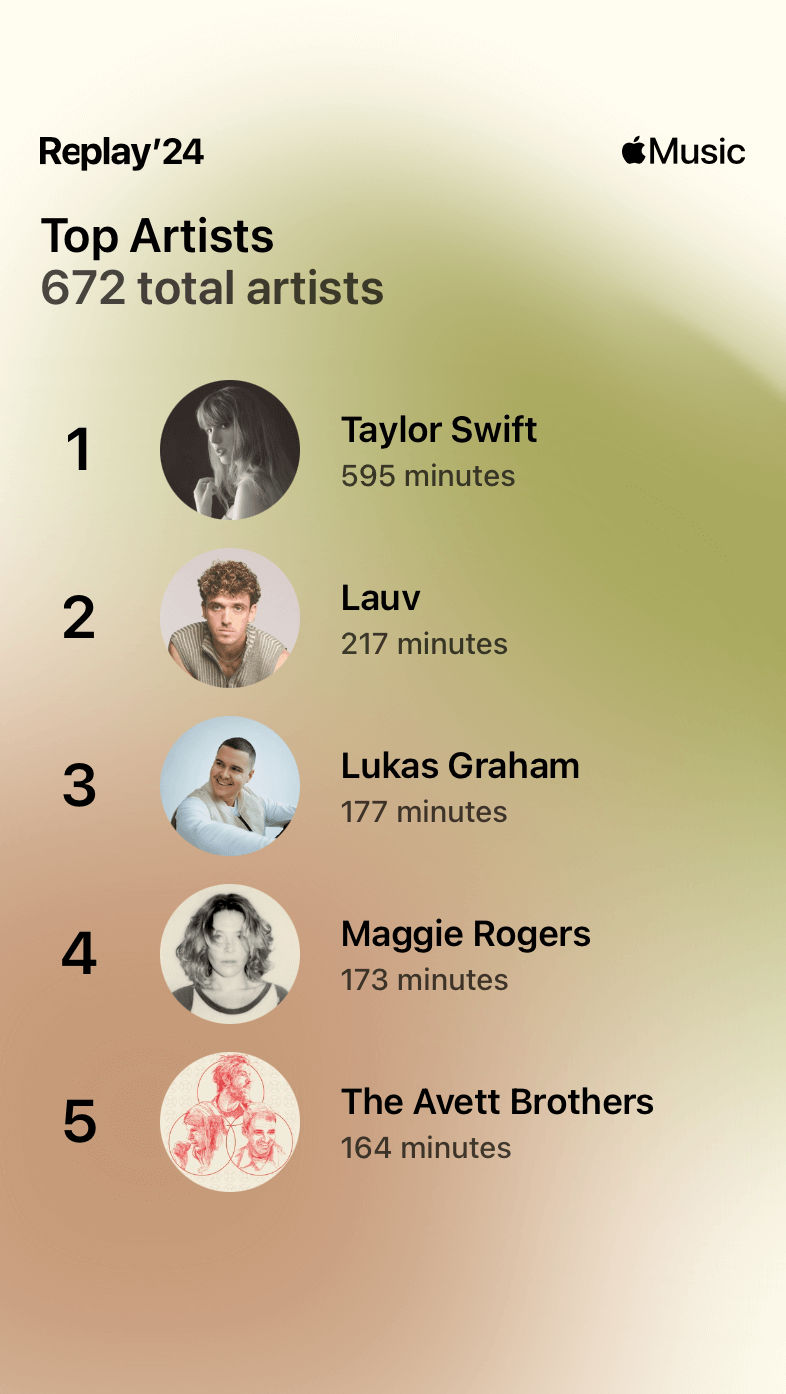 图表列出了顶级音乐艺术家及其收听时间。泰勒·斯威夫特以 595 分钟领先。其他艺术家包括劳夫、卢卡斯·格雷厄姆、玛吉·罗杰斯和艾维特兄弟。标题为“Replay’24 位顶级艺术家,总共 672 位艺术家。”这里没有人特别令人惊讶。我喜欢我喜欢的,这些艺术家统治! ⌘