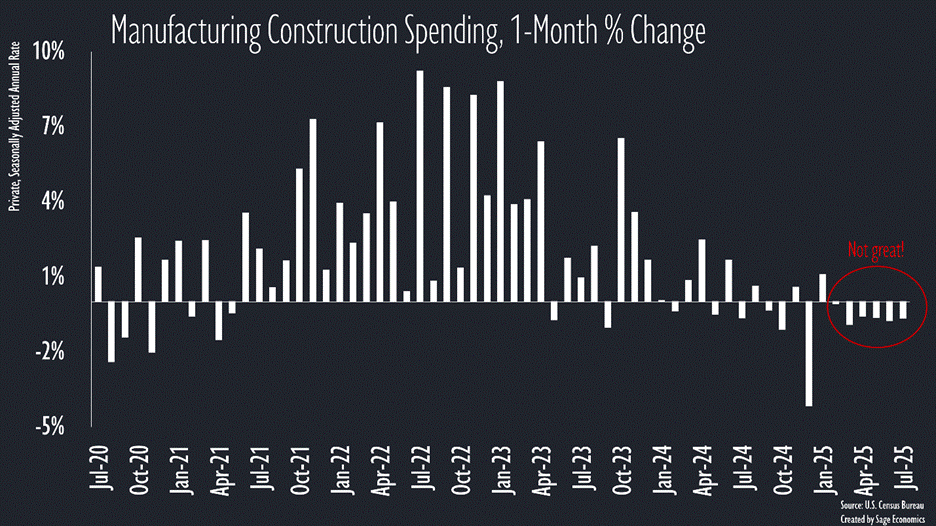 美国约50%的进口产品用于制造业。更高的税率(例如对钢铁、铝和铜征收50%的关税)正在对制造业运营造成严重破坏。移民执法行动——例如上周针对现代汽车佐治亚州工厂的行动——也无济于事,至少从刺激生产和投资的角度来看是如此。