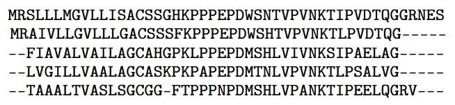 这是一个多序列比对示例。顶行是目标蛋白的氨基酸序列;其下每一行都是一个相关蛋白的序列。短横线表示序列间的空位。(来自OpenProteinSet:Ahdritz 等人开发的用于大规模结构生物学训练的数据,采用 CC BY 4.0 许可协议)