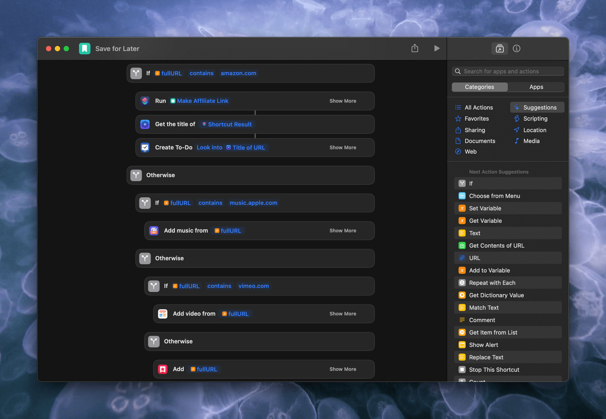 对我来说,我一直在 Safari 的 URL 上运行一些快捷方式。我的“ Amazon Affiliate Linker”快捷方式,以及我的仅举两个例子: “ URL 菜单”快捷方式(一组与链接相关的快捷方式的包罗万象的菜单)。但我最喜欢的是我的“保存以供稍后使用”快捷方式。那个被配置为某种交通控制器。根据传入的URL类型,它决定链接是否应保存到Play (YouTube 和 Vimeo 链接)、 MusicBox (Apple Music 链接)、作为Things任务(Amazon 链接)或我的稍后阅读应用程序(其他任何东西,几乎都是文章或其他网页)。而且因为我更改了稍后阅读的应用程序(例如其他人更换内衣),所以我可以非常轻松地交换不同的快捷操作以开始保存指向我最新文章保护程序的链接。