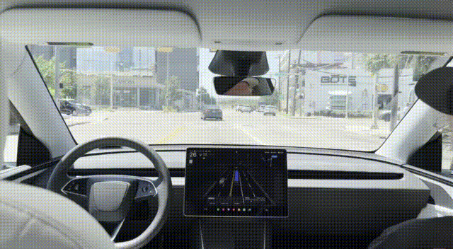 • 一辆特斯拉自动驾驶出租车驶近一个十字路口,前面一辆汽车正试图左转,但后来改变了主意。当这辆汽车突然转向回特斯拉的车道时,自动驾驶出租车平稳地减速,给它腾出了空间。