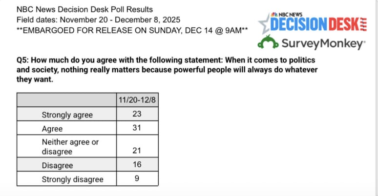 很多民调都显示公众非常愤怒,但我只想重点关注一个数据点。在最近NBC的一项民调中,54%的美国人认同“在政治和社会问题上,一切都无关紧要,因为有权势的人总是为所欲为”。爱泼斯坦丑闻之所以如此引人注目,是因为它揭示了一个我们都心知肚明的事实——有权势的人与你我截然不同。