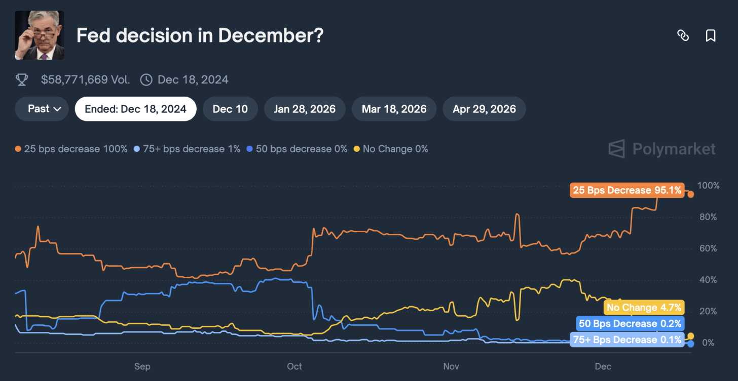 就连 Polymarket 目前也认为 12 月份降息 25 个基点的概率高达 95%。