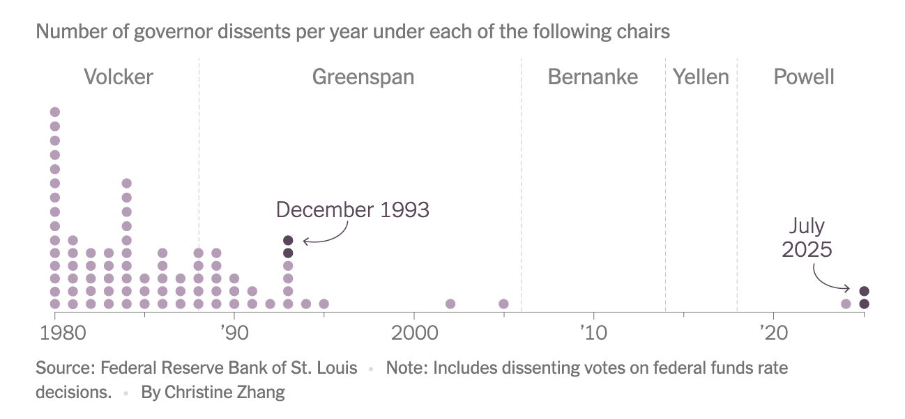 并非一位,而是两位美联储理事在同一次会议上投反对票。自1993年以来,我们从未见过两位美联储理事在同一次会议上投反对票,因此这种情况实属罕见,令人侧目。当时,大多数人将这一异常现象归咎于政治因素。美联储主席杰罗姆·鲍威尔似乎并不喜欢唐纳德·特朗普,而投反对票的两位美联储理事正是特朗普提名的。
