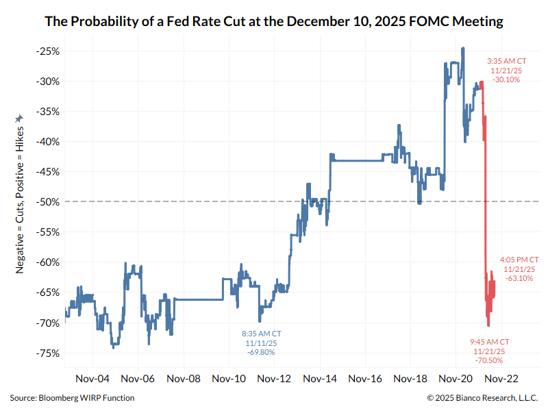 如果美联储今天而非12月10日举行货币政策投票,吉姆·比安科认为,目前的投票结果将是7比5,赞成再次降息的比例会更高。市场对12月降息的概率估计约为63%,也印证了这一观点。