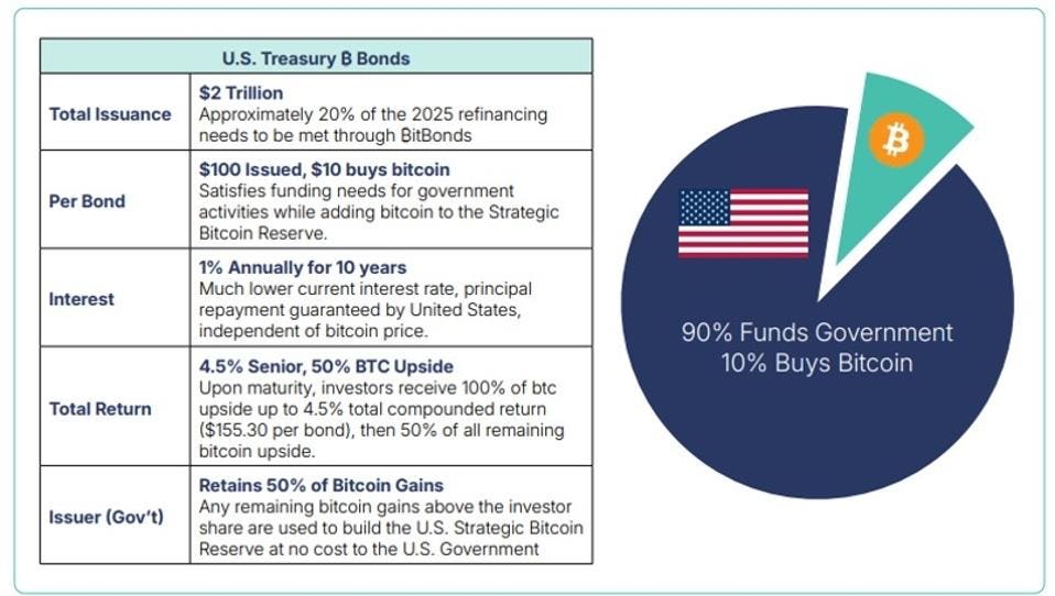 “比特币债券与普通债券类似,财政部会将债券的90%用于政府融资。但剩余的10%资金将用于购买比特币……到期时,投资者将获得比特币价格上涨的全部收益,最高可达总复合收益的4.5%。达到这一基准后,投资者将获得剩余比特币价格上涨收益的50%。与此同时,政府将保留剩余50%的比特币价格上涨收益,用于构建战略比特币储备。”