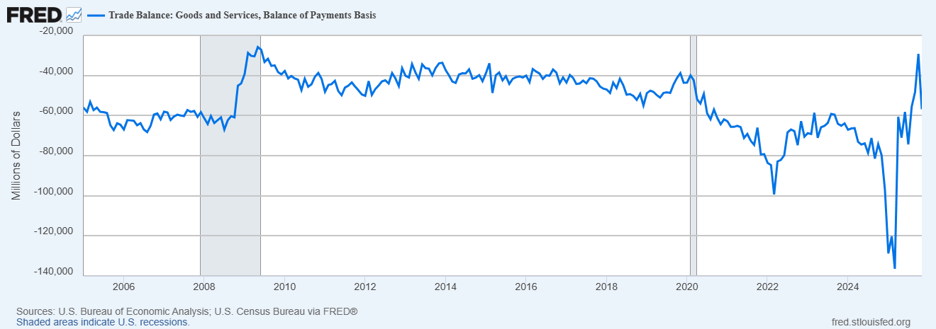 关税并没有为美国人创造大量制造业就业机会;事实上,制造业就业岗位正在减少。但同样值得探讨的是,关税是否对美国的整体贸易逆差产生了影响。要知道,特朗普认为贸易逆差本身就是坏事——是美国在全球竞争中“失败”的标志,也是美国依赖外国的一种体现。