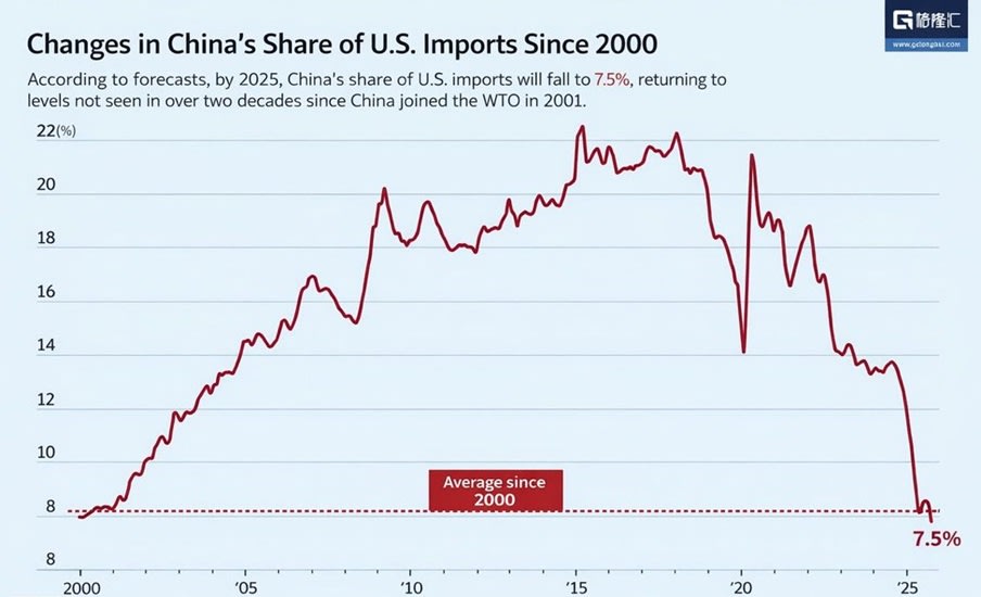 但美国对华双边贸易逆差已大幅下降。自疫情爆发以来,美国从中国进口的商品比例一直在下降,但在特朗普宣布加征关税后,这一比例更是断崖式下跌。过去,美国超过五分之一的进口商品来自中国;如今,这一比例已不足十三分之一。