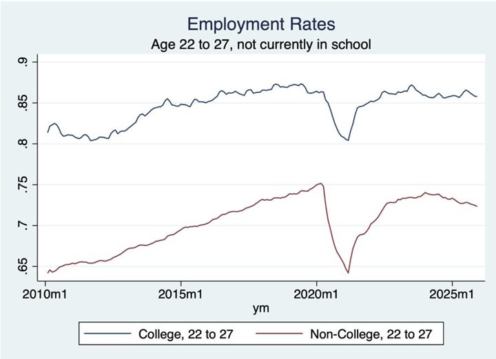 正如你所看到的,22-27岁未获得大学学位的人群,其就业趋势基本符合我们基于劳动力市场放缓的预期。但年轻大学生的比例远高于我们根据放缓趋势所预期的比例。