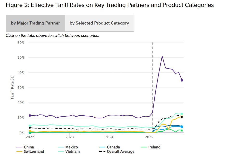 因此,虽然关税并未大幅减少贸易逆差或促成制造业复兴,但它们似乎确实在使世界两大经济体脱钩。需要注意的是,对华关税税率仍然远高于对其他国家的税率: