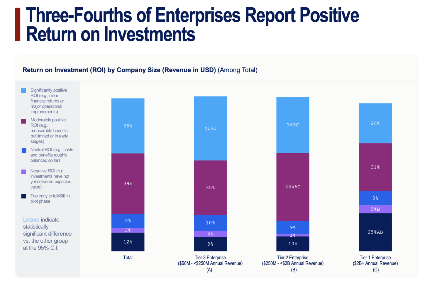 这些担忧或许不无道理,但宾夕法尼亚大学沃顿商学院的一项新研究却让情况变得复杂起来。该研究发现,在衡量其生成式人工智能投入回报率的企业中,74%的企业已经获得了正回报,而且更多企业预计在未来两到三年内也将获得正回报。