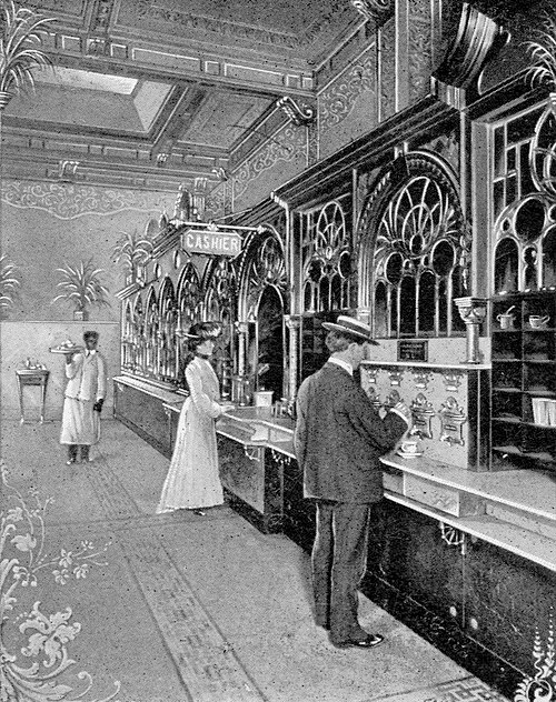 好吧,事情是这样的:显然在 20 世纪初,有一家连锁自动餐厅,人们可以往投币口投五分钱,然后从一大面自动售货机墙上买到一块馅饼(或者一份通心粉和奶酪,或其他类似的食物)。