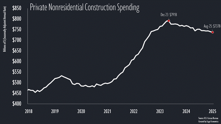 自 2023 年 12 月达到峰值以来,私人非住宅建筑支出持续下降。