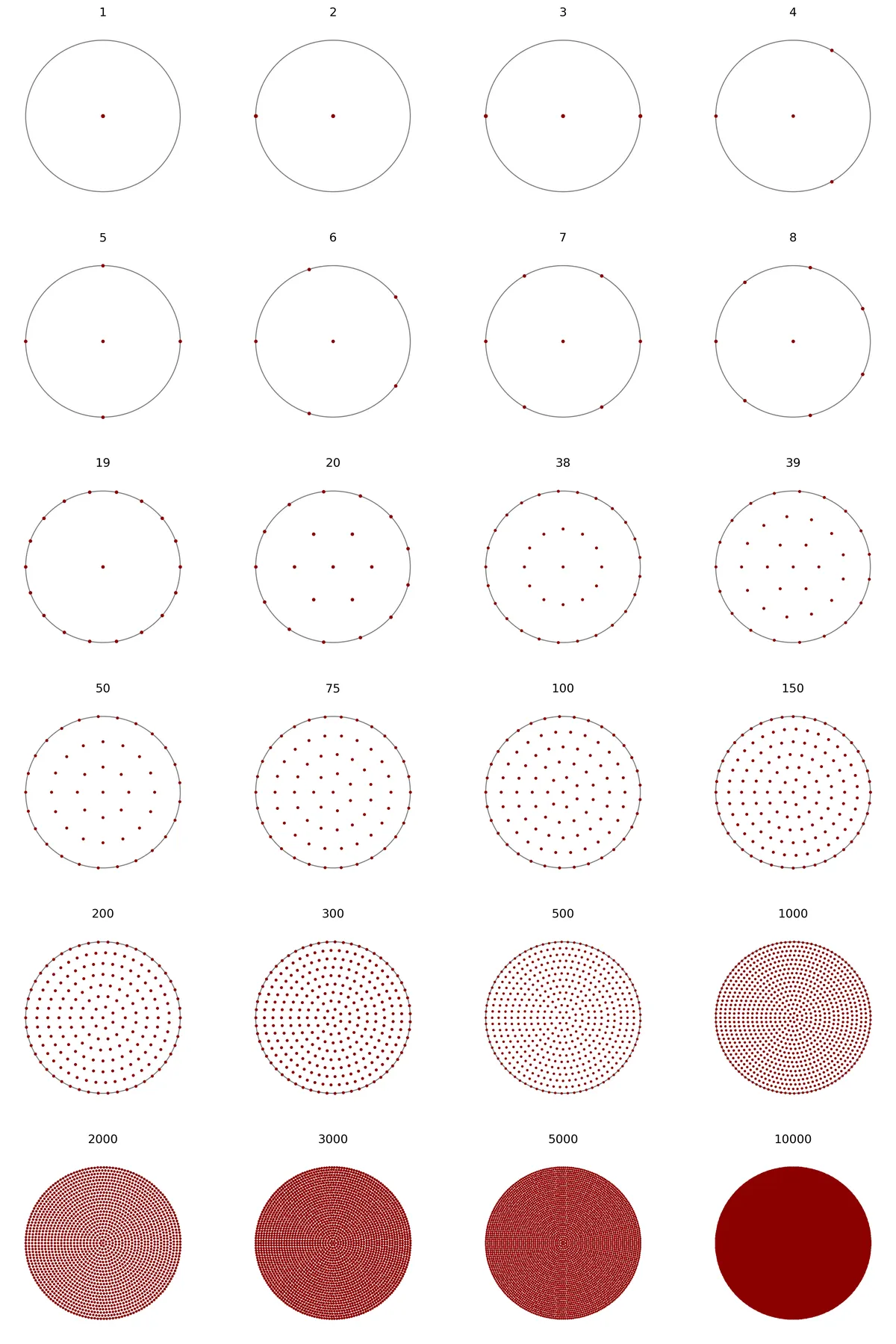 考虑在直径为 D 的圆盘上生成 N 个点的问题。该函数必须是确定性的,并且这些点在圆盘上均匀分布。重要的是,对于 N 的任何整数值,我想生成恰好N 个点。