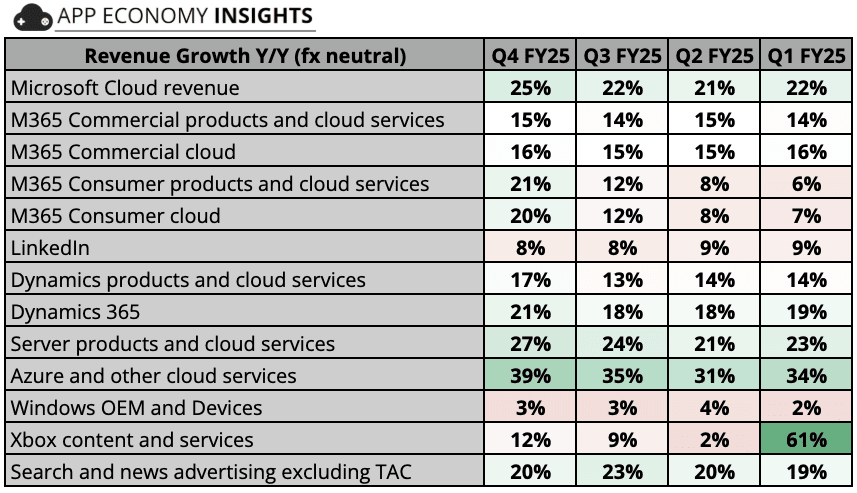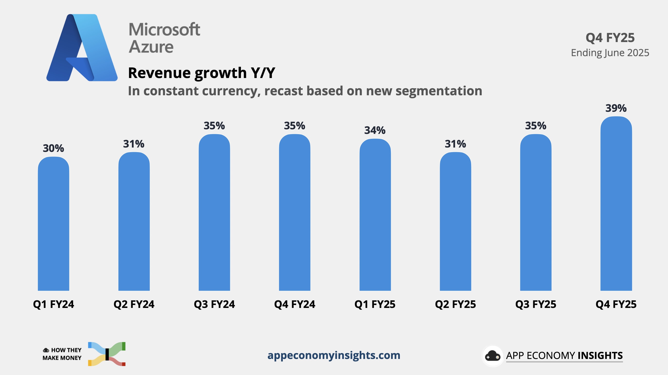 📈 Azure 创下新高:受大型企业客户核心基础设施需求的推动,Azure 同比增长 39%,远超 34-35% 的预期。令人惊讶的是,管理层此次并未透露 AI 对 Azure 增长的贡献。但他们表示,Azure 销售额在过去 12 个月内达到了750 亿美元(同比增长 34%)。相比之下,截至 3 月份,谷歌云销售额为 490 亿美元,AWS 销售额为 1120 亿美元。