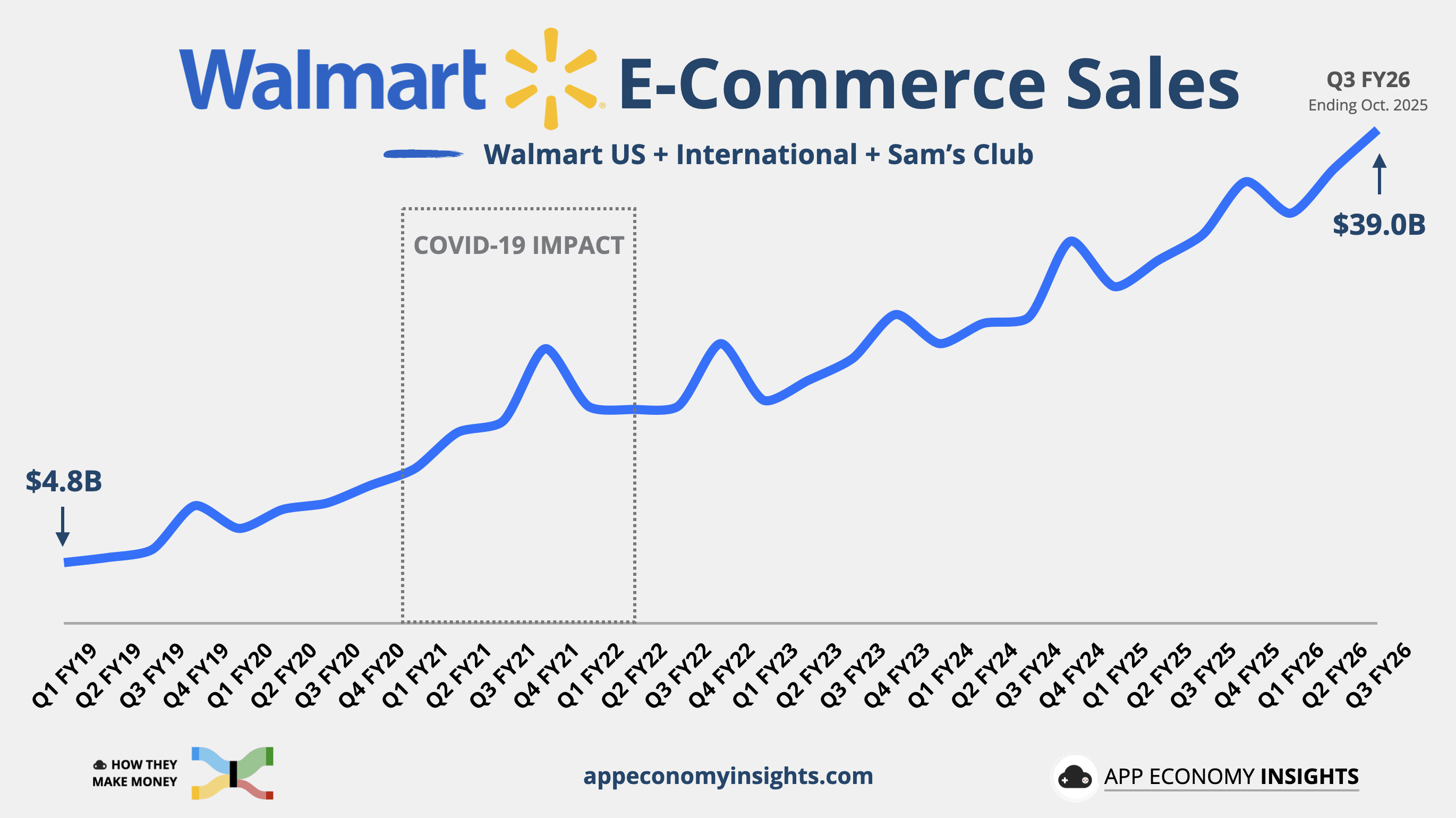 沃尔玛美国同店销售额增长4.5%,国际销售额按固定汇率计算增长11%。电子商务再次成为增长主力,全球销售额增长27%,所有线上业务板块均增长超过20%。高收入消费者的涌入、强劲的食品杂货销售势头以及百货商品销售的改善均对此有所贡献。目前,电子商务销售额已占沃尔玛总收入的近22%。