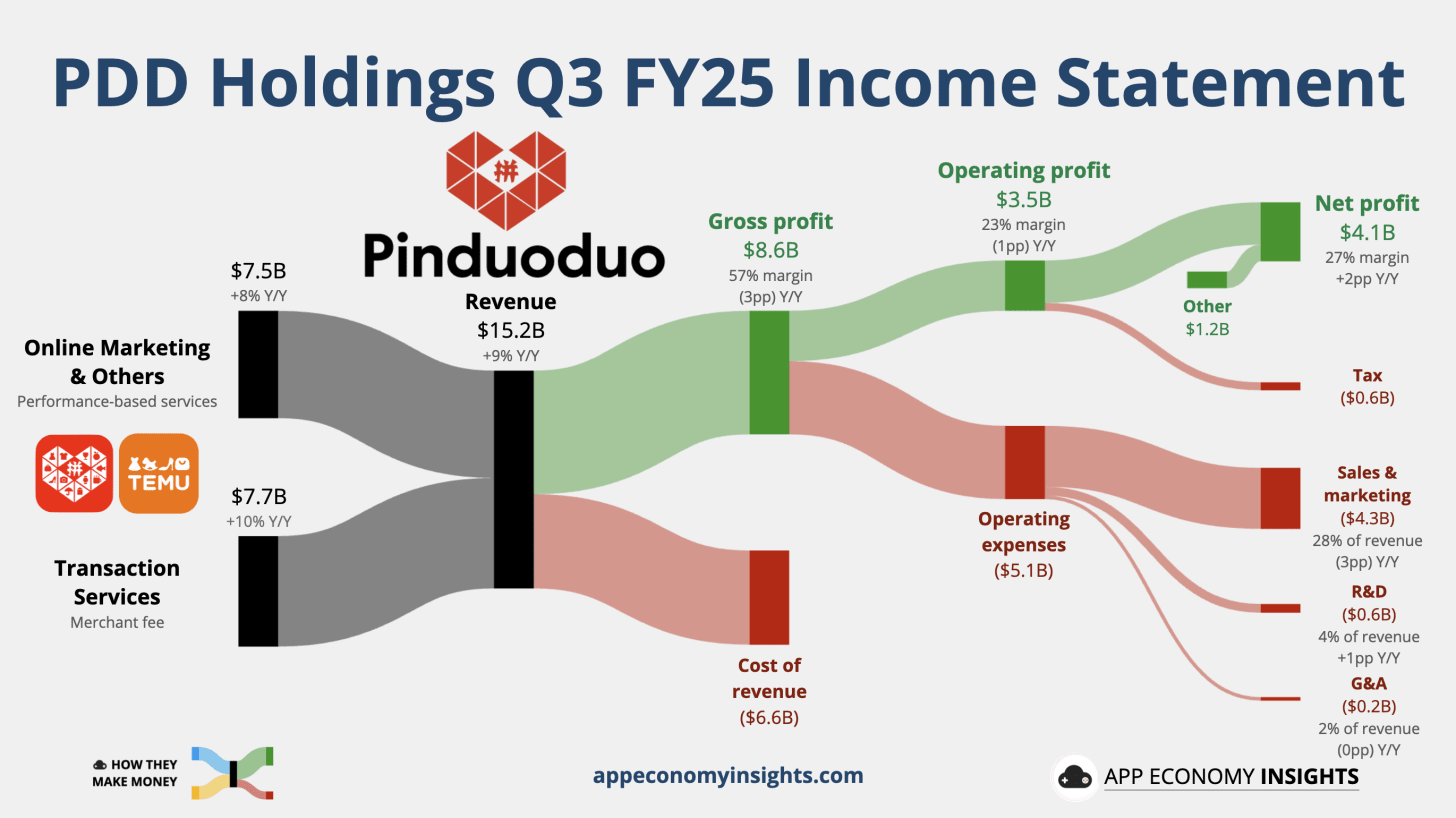 Temu的母公司PDD Holdings第三季度营收同比增长9%至152亿美元(低于预期9000万美元),受中国市场严峻的消费环境影响,增速依然缓慢。分业务来看,在线营销服务(按效果付费)增长8%,交易服务(含商户手续费)增长10%。