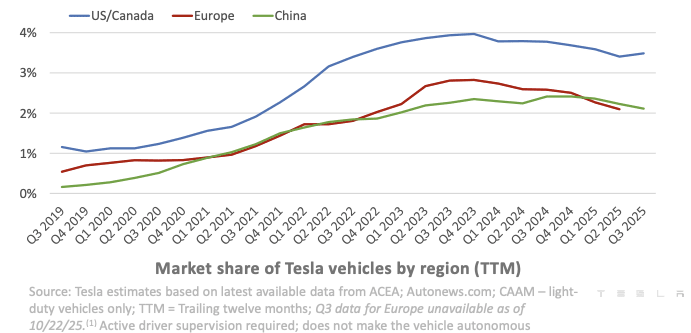 🌍 市场份额:经过多年的扩张,特斯拉在所有地区的市场份额都在稳步下滑。特斯拉的演示文稿中展现了令人担忧的过去12个月的前景。美国/加拿大的反弹很可能只是电动汽车税收抵免截止日期提前拉动需求的“幻象”。