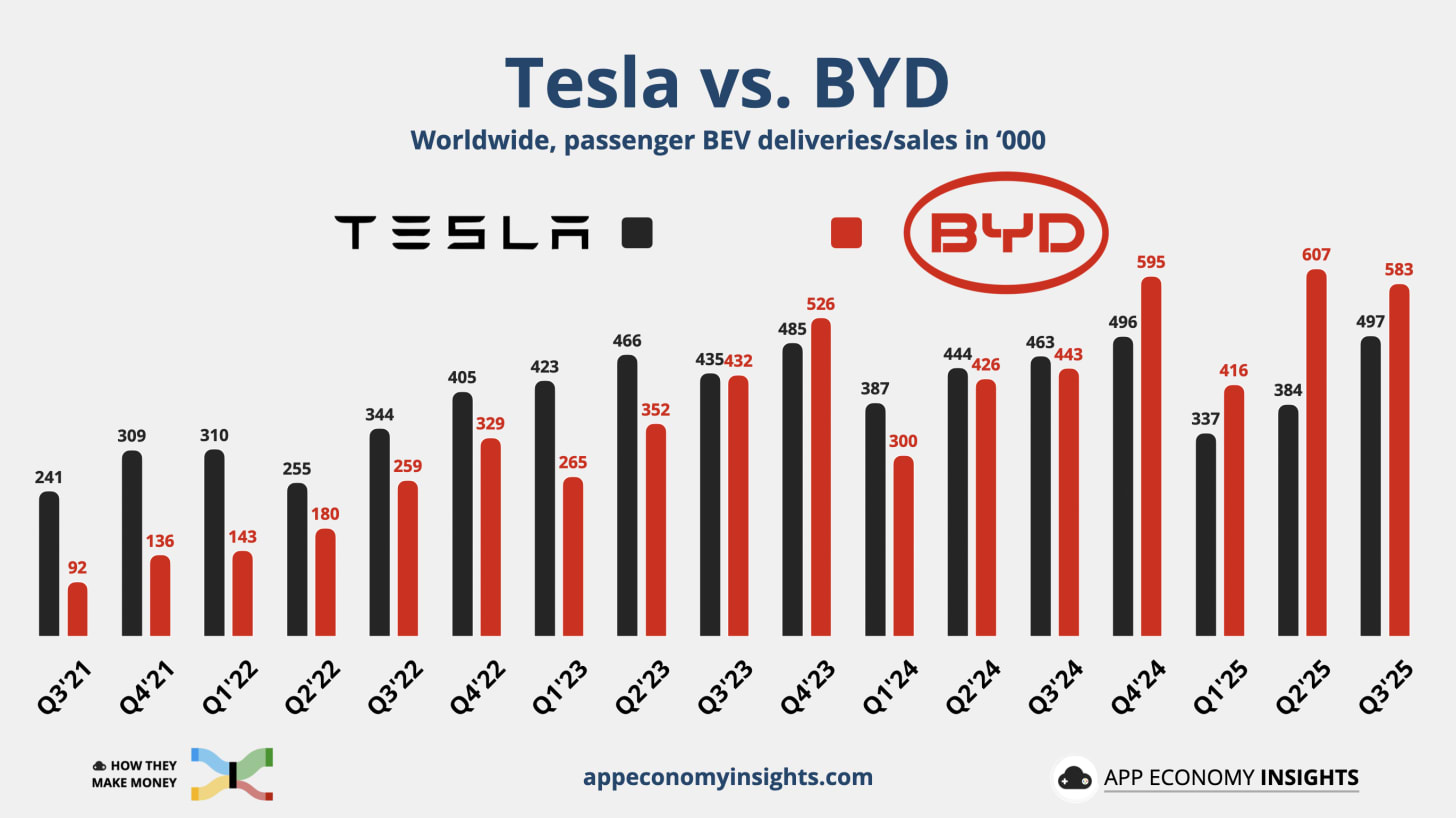 🥊 比亚迪摊牌:比亚迪纯电动车交付量同比增长 32%,达到 58.3 万辆,连续第四个季度扩大了对特斯拉的领先优势。虽然这并非一个完美的对比(比亚迪的交付并非直接面向消费者),但这一趋势清晰地说明了问题。