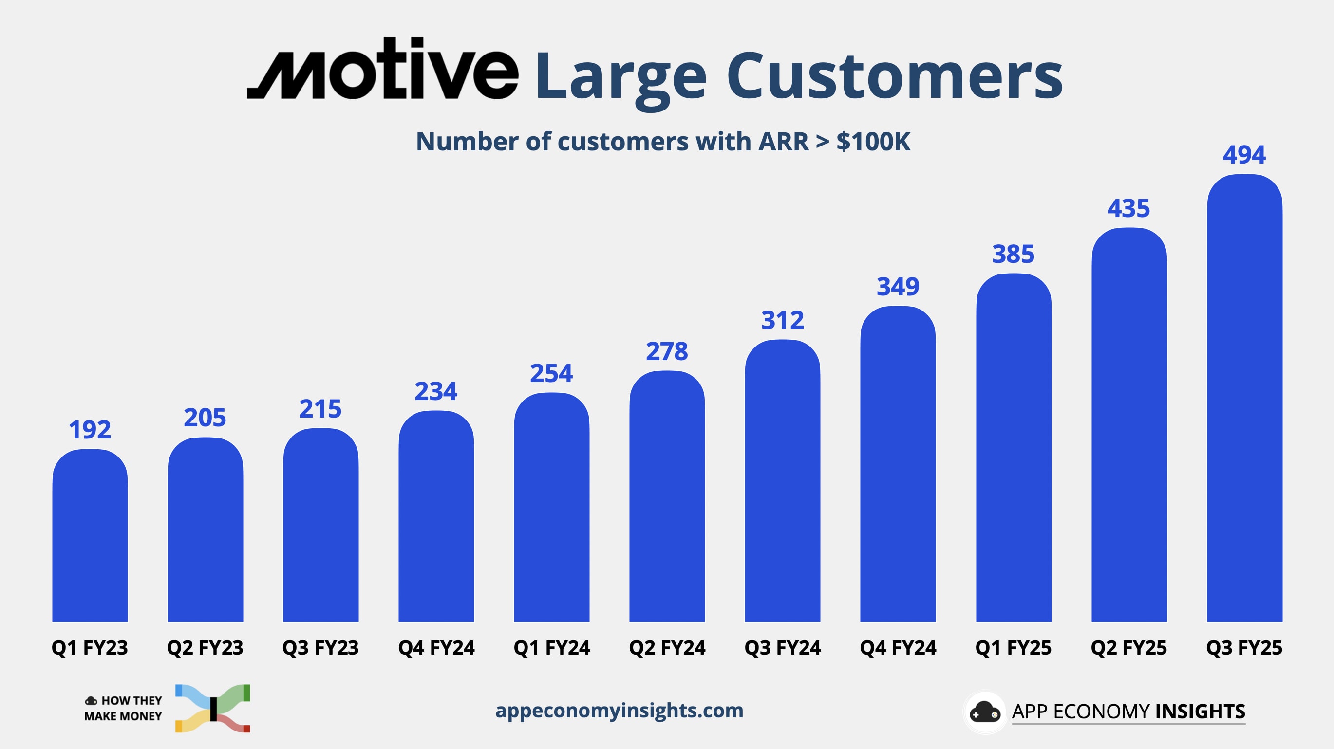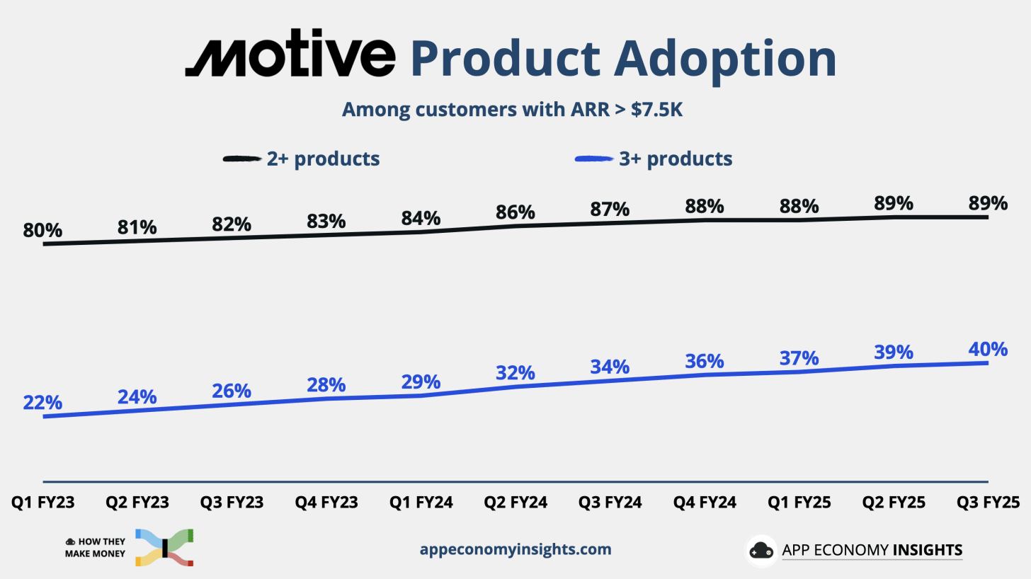 Motive 的业务扩张以使用量为导向,而非以合同为导向。随着车队规模(车辆、驾驶员、资产和地点)的增长,收入也会自动增长。规模更大的车队会产生更多数据,采用更多模块,并随着运营复杂性的增加而采用更少的系统进行标准化。这种动态在数据中体现得淋漓尽致,大型客户的扩张速度远超小型客户。核心客户的多产品采用率也在稳步提升。