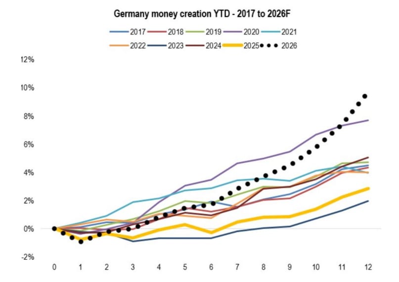 1) 2026 年货币创造量将大幅增长:来自美国(OBBB)、德国、日本、韩国等国的财政支出加上人工智能资本支出将导致货币增发;